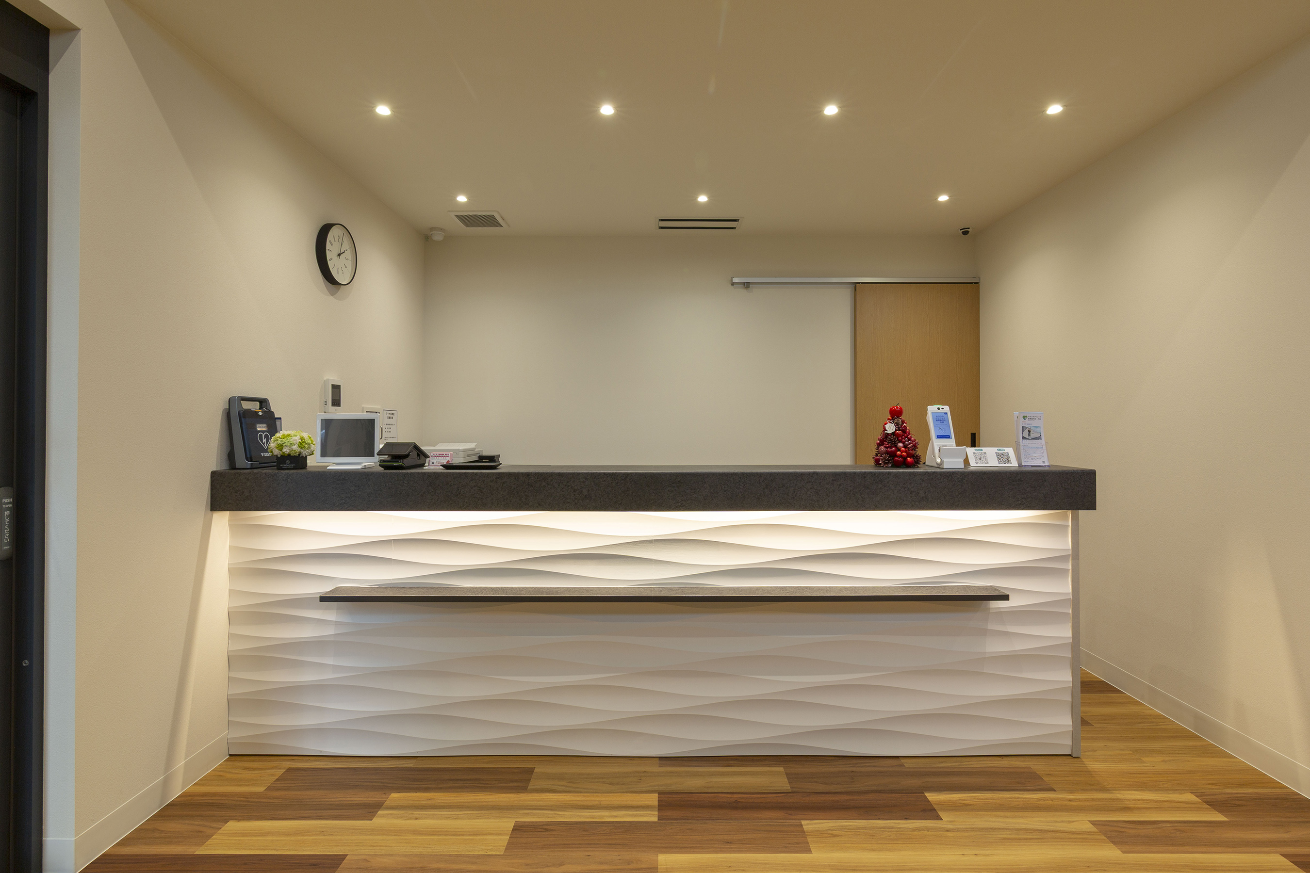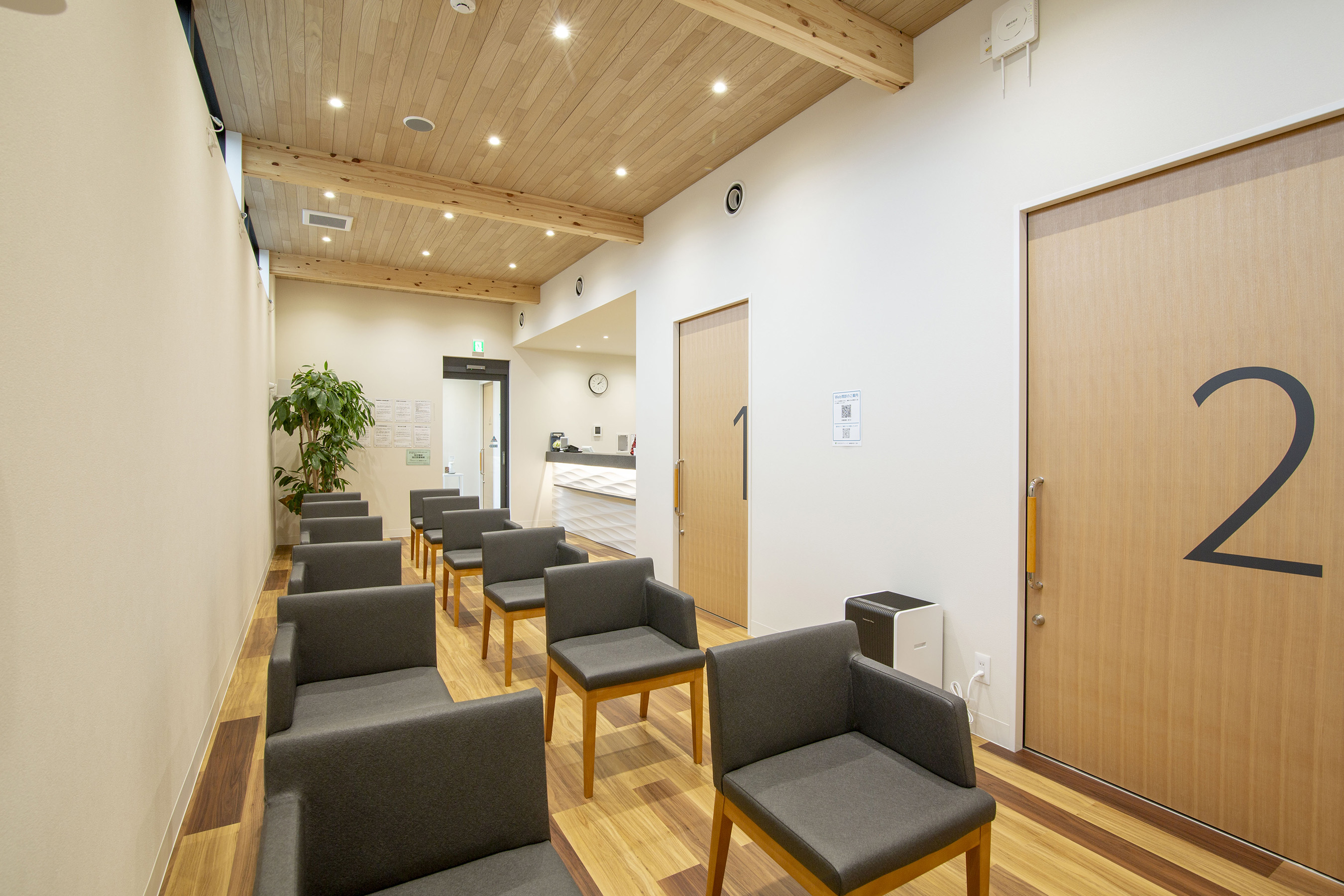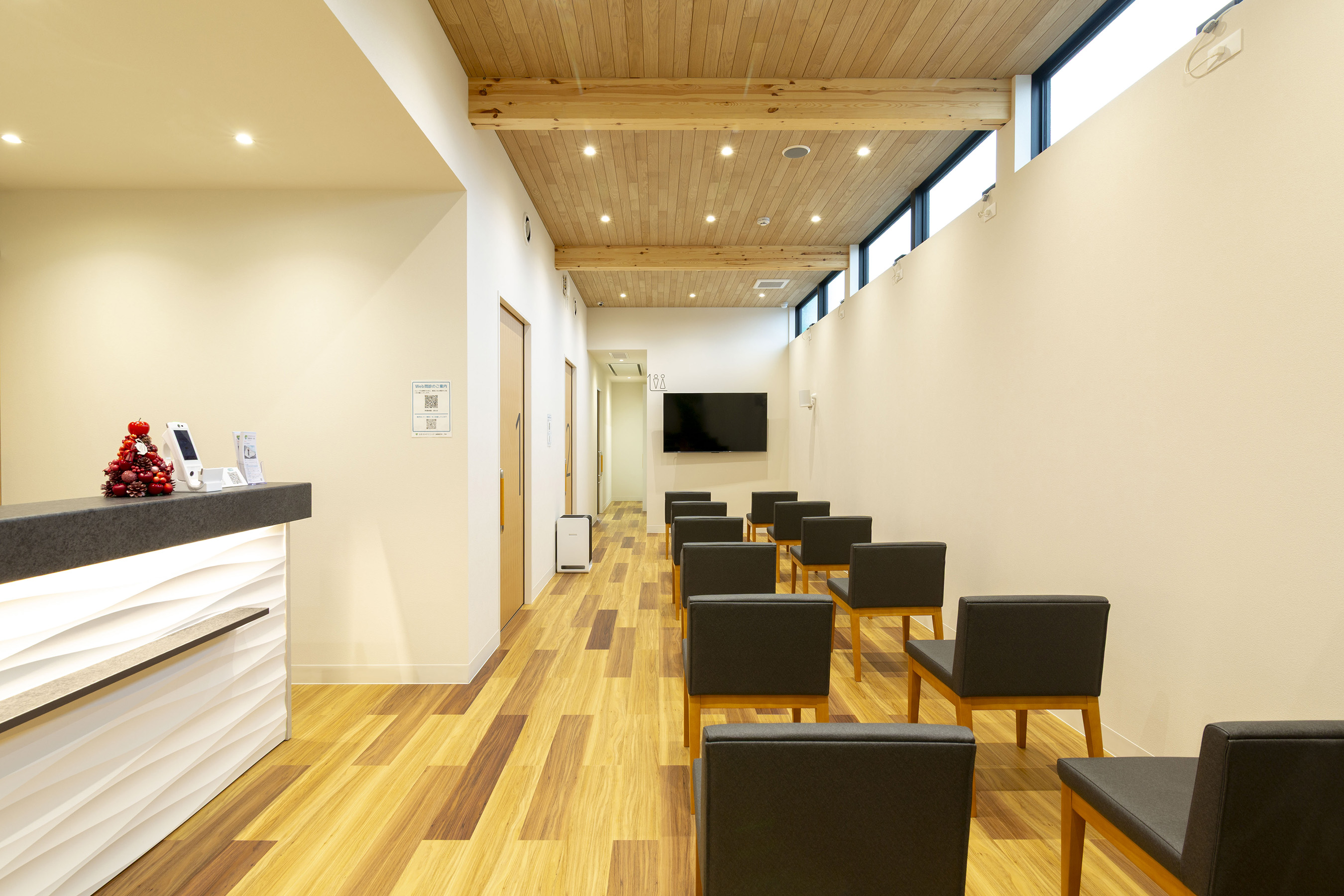 待合室は、梁を木の現しとした木造ならではの空間とし、やさしい木の質感と温もりに包まれる設えとしています。自然素材がもたらす落ち着いた雰囲気は、来院時の緊張を和らげ、患者様に安心感を与えます。