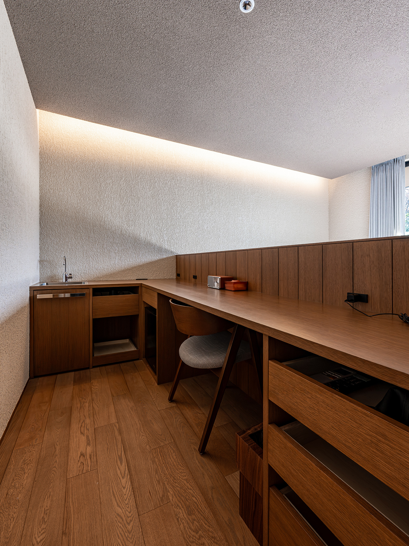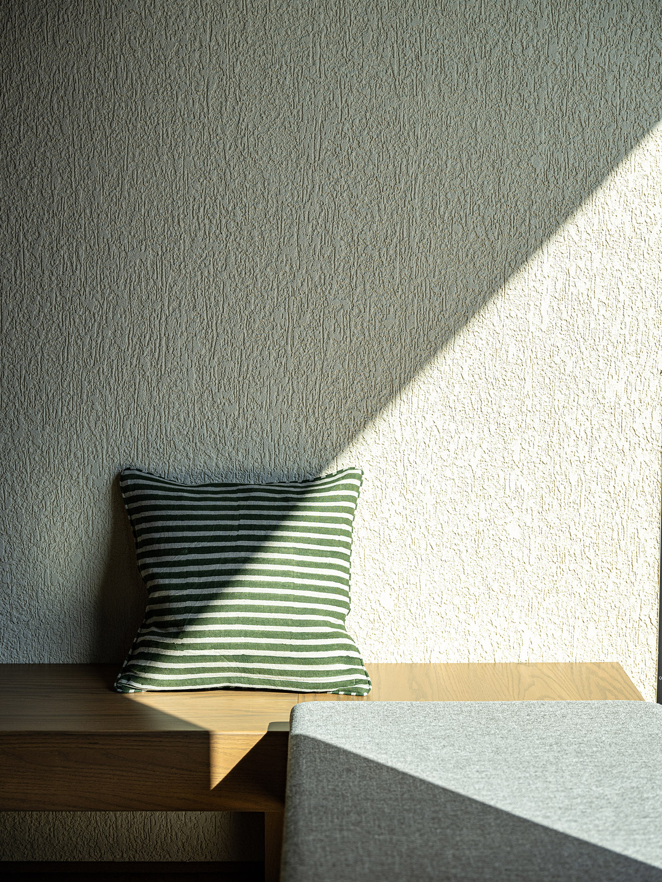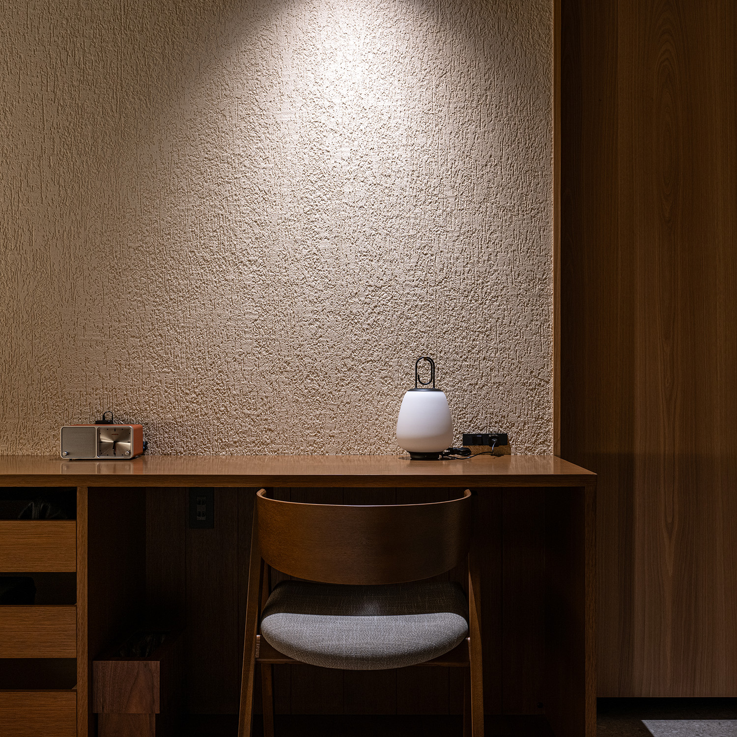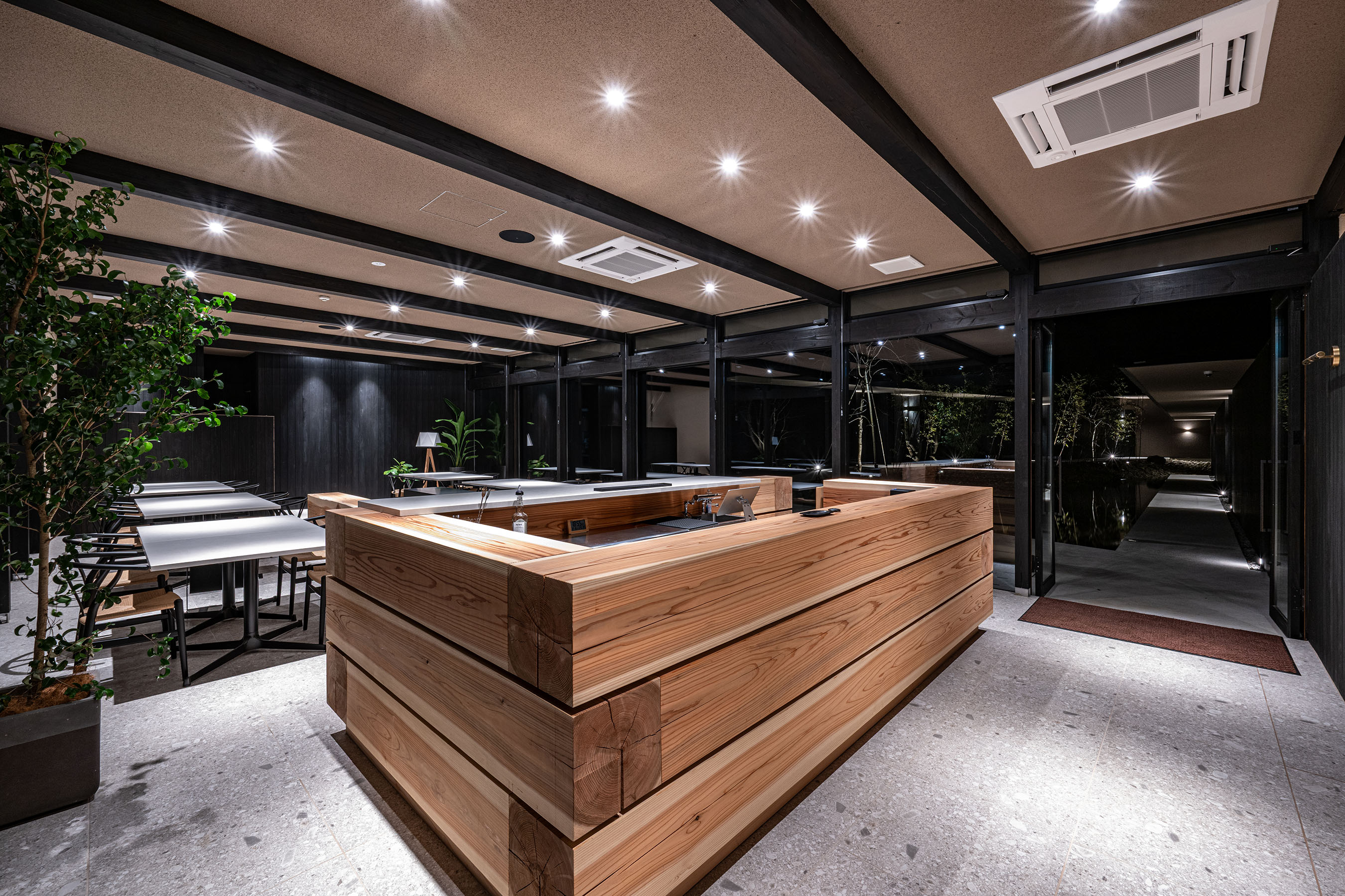 木・塗り壁・石材という“時間を刻む素材”で構成する。