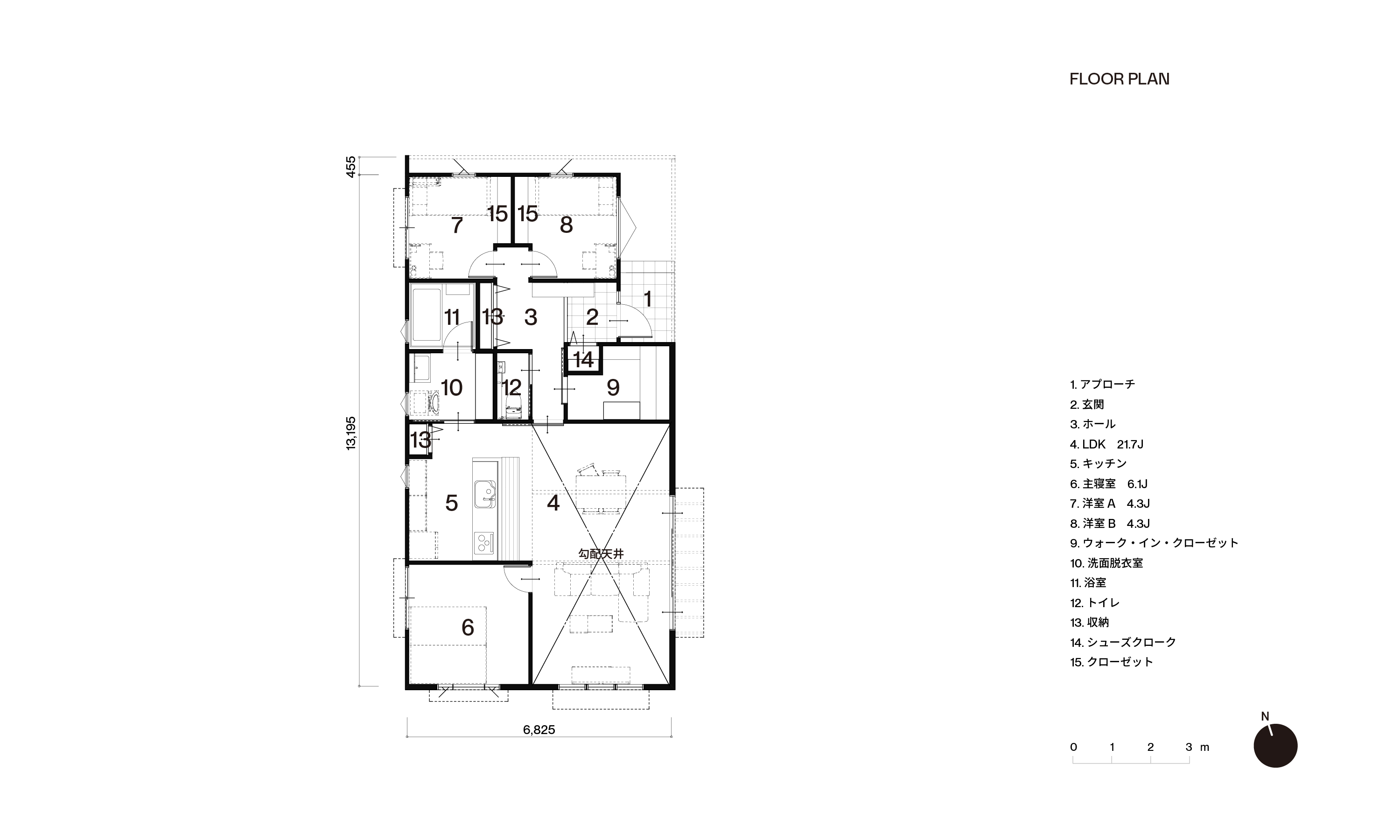 動線は、玄関を中心に共有スペースとプライベートスペースに分けることでプライバシーに配慮。キッチンは、水回りに繋がる動線を確保し、コンパクトな家事動線となっています。共有スペースのリビングは勾配天井で開放感をプラス。南側上部に設けた開口部から陽の光をたっぷりと取り込みます。さらに収納も充実。ゆとりあるライフスタイルを叶える住まいです