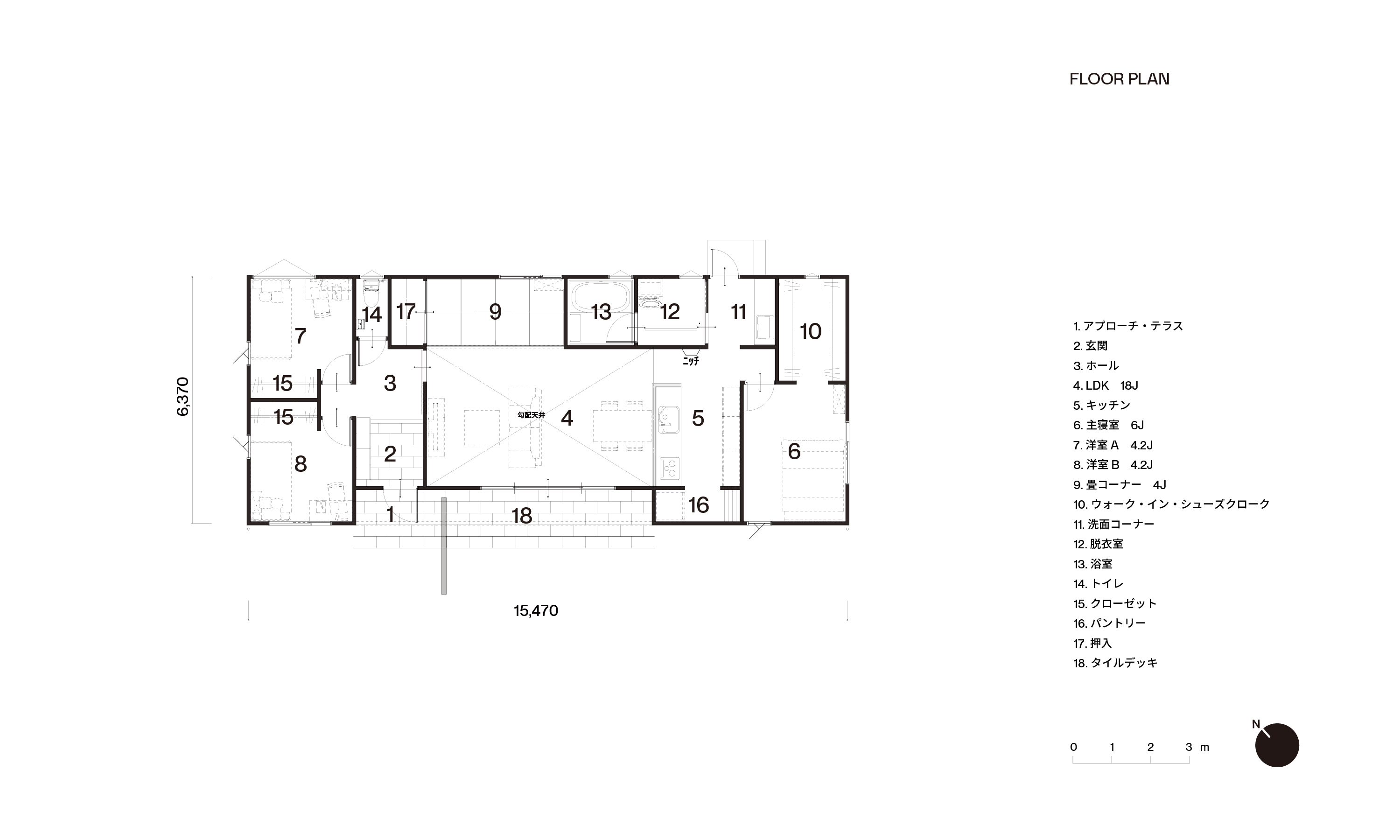 共有スペースを中心に各部屋へのアクセスを可能にした住まい。勾配天井のLDKは、4畳の畳コーナーを隣接し気分によってくつろぎの空間を楽しむことができます。キッチン横のパントリー、各洋室にはクローゼットを設けるなど収納豊富。バーベキューなどを楽しめるゆとりのあるバルコニーは、充実した家族時間を叶えてくれます。