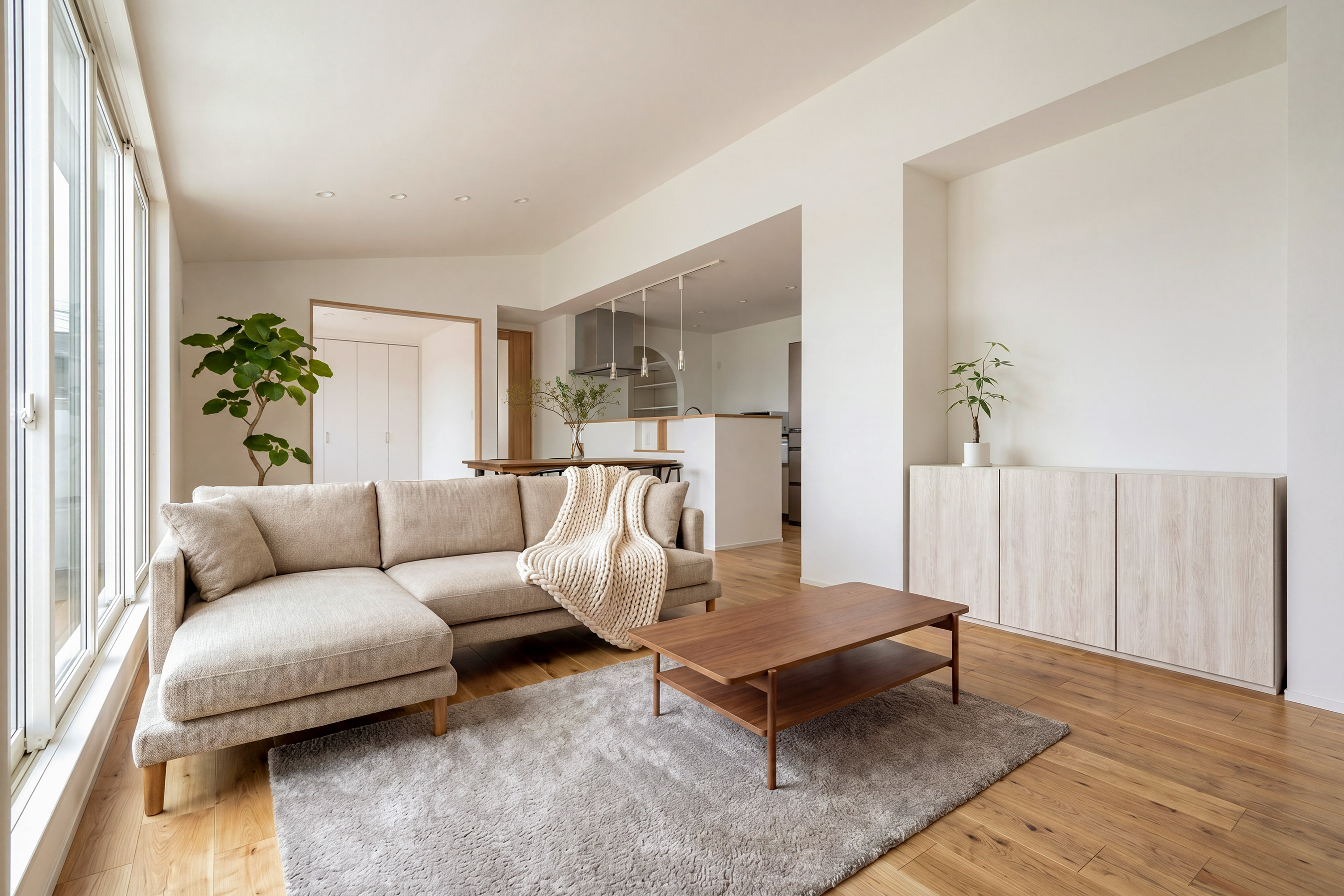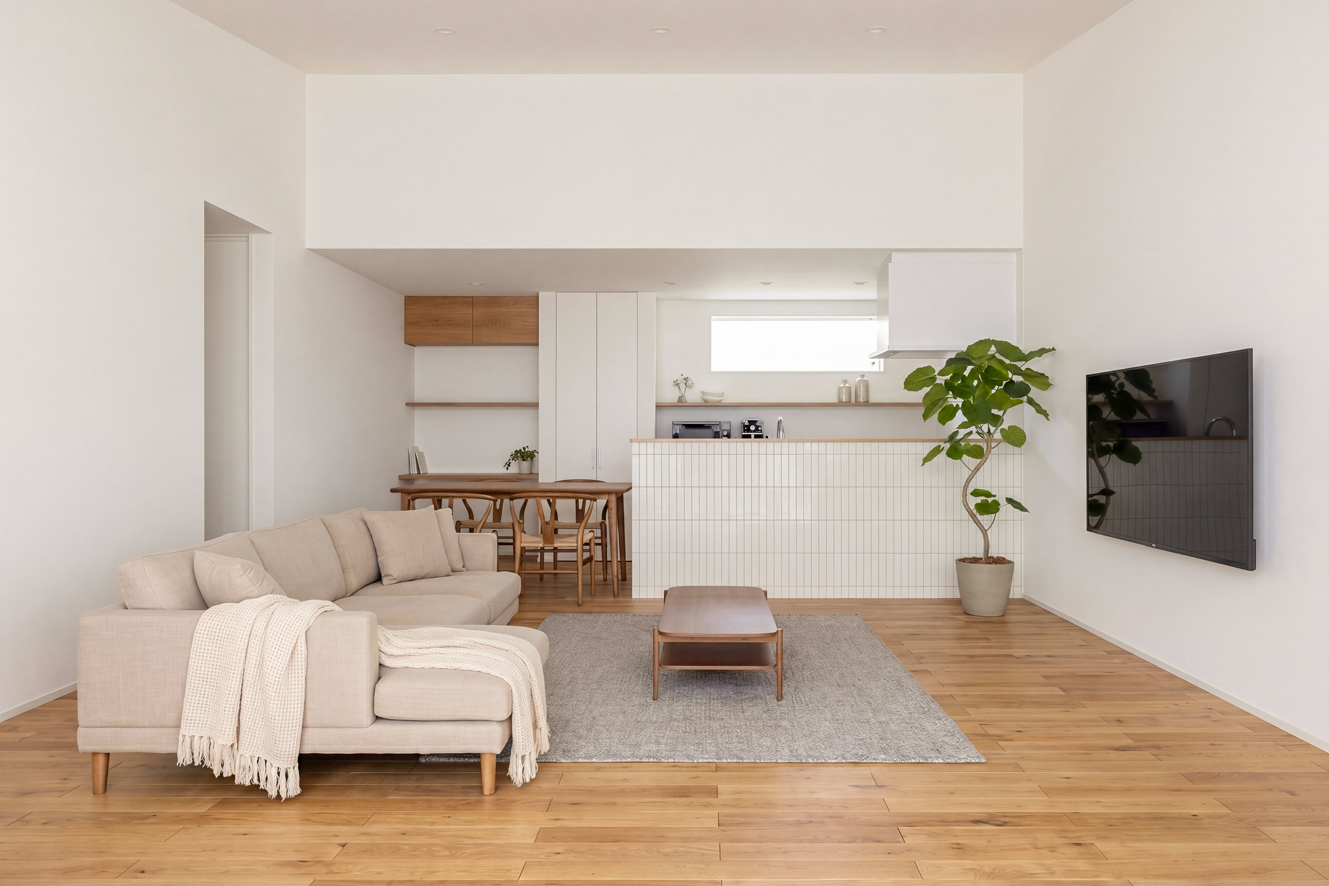 木の家の特徴とも言える大きな吹き抜けから、家中に明るい日差しが入り込み、ナチュラルなトーンのインテリアと合わせ、清潔感のあるインフィルとなっています