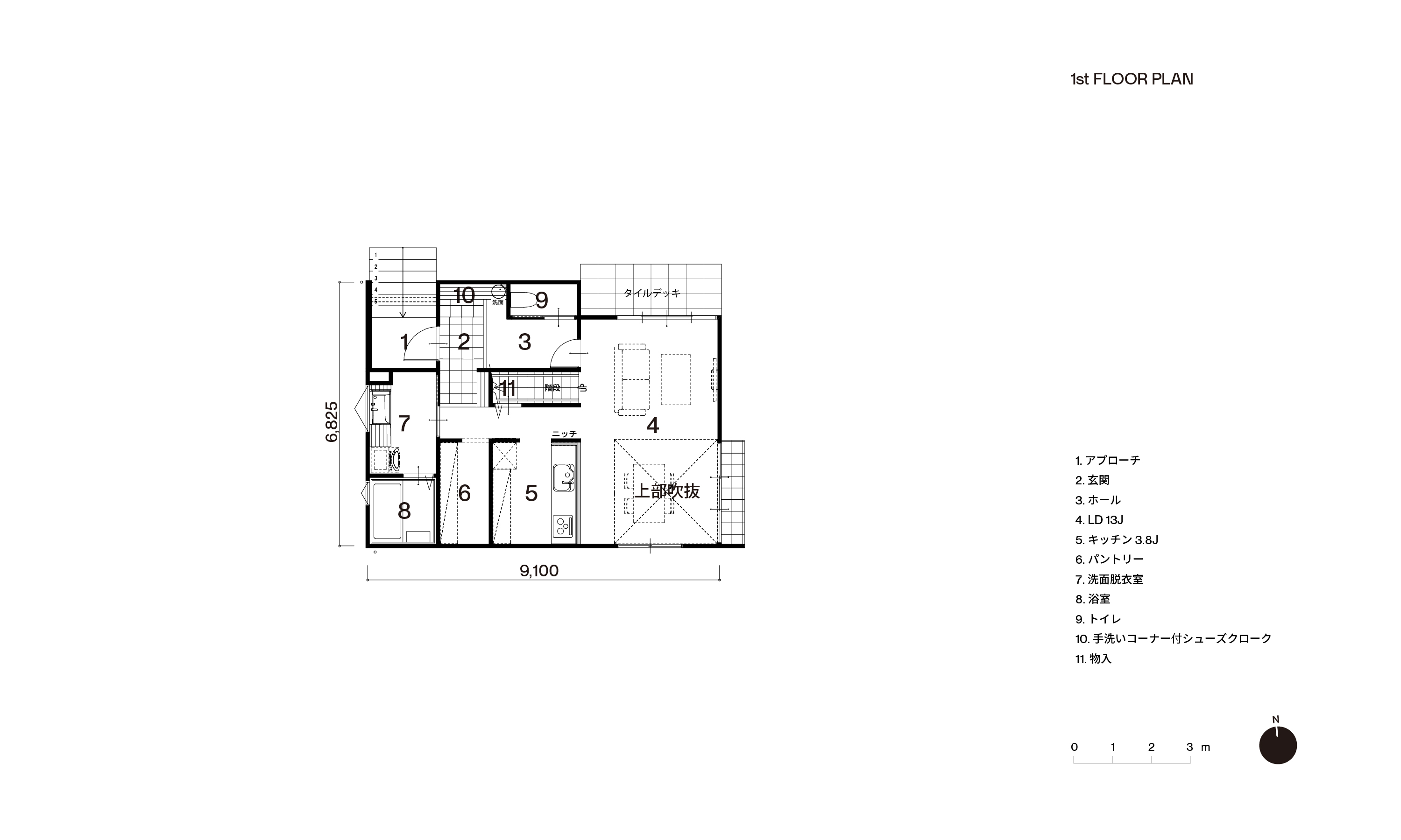 吹き抜けの窓から降り注ぐ心地よい光が、一家の食卓の時間を優しく包みます。