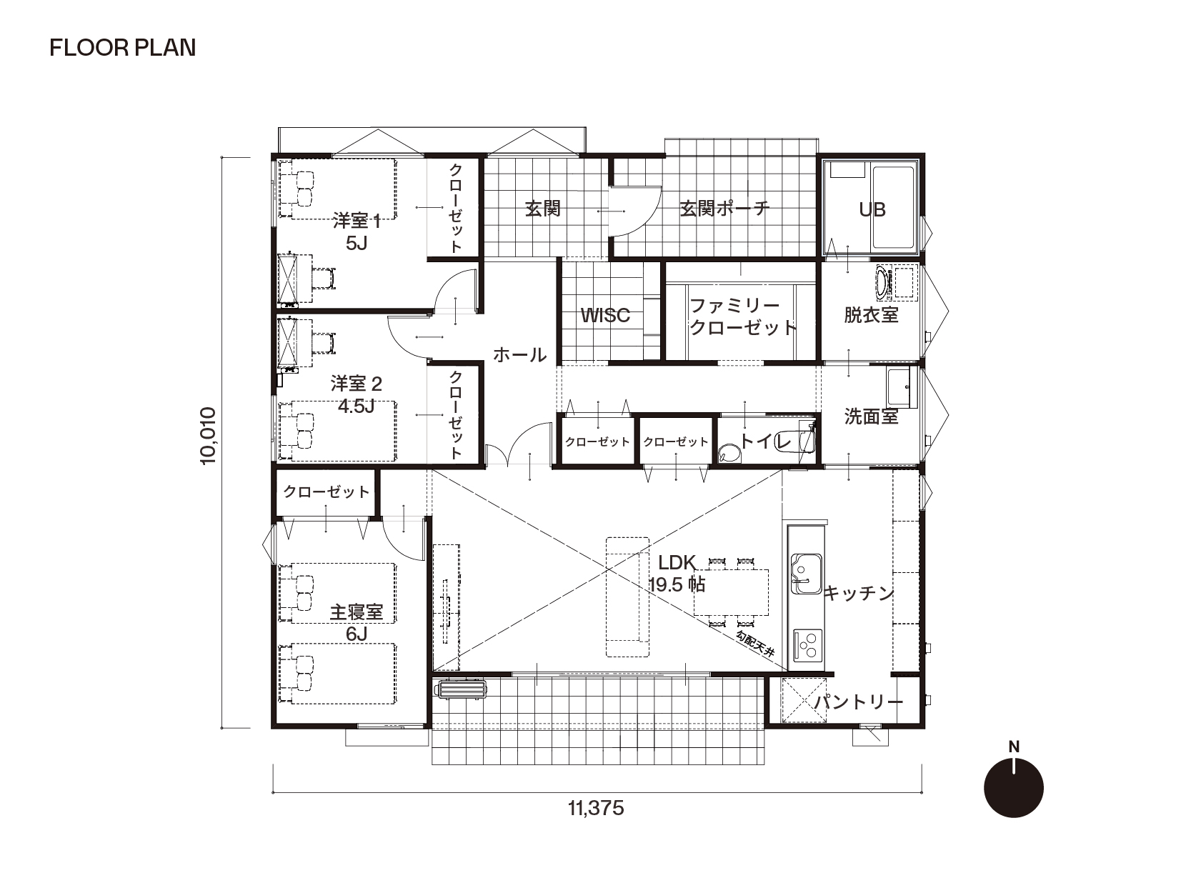 ゆとりのある玄関ポーチから扉を開けて広がる玄関は、ホールを中心にLDK、水回り、寝室へと広がる動線に。開放感のある勾配天井のLDKや面するテラスと、家の中でも外でも家族の時間を楽しむことができます。キッチン横にはパントリー、水回りへと繋がる動線にはファミリークローゼットなど、充実した収納空間を確保。玄関から広がる動線が、家族一人ひとりの生活を優しく繋ぐ住まいです。