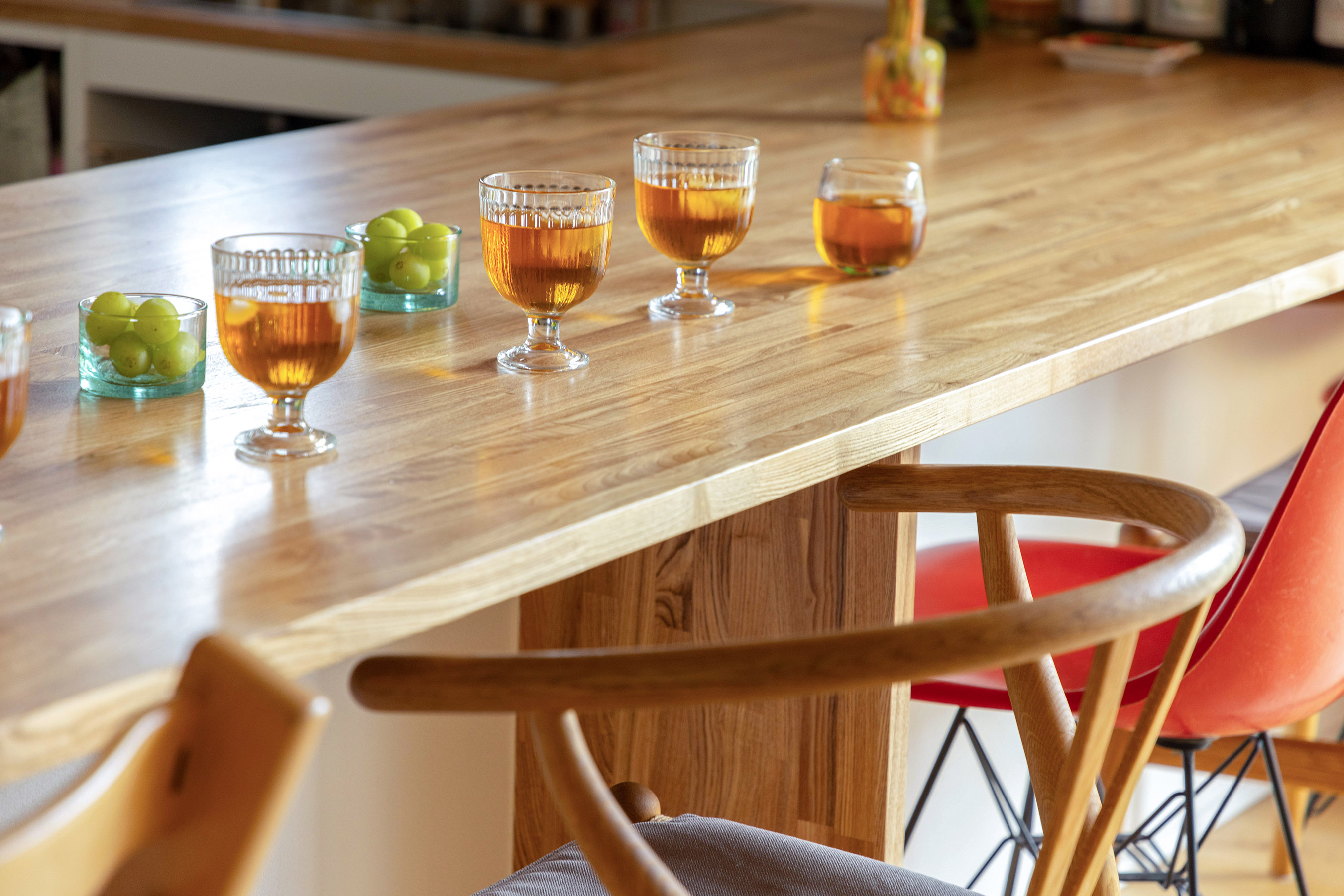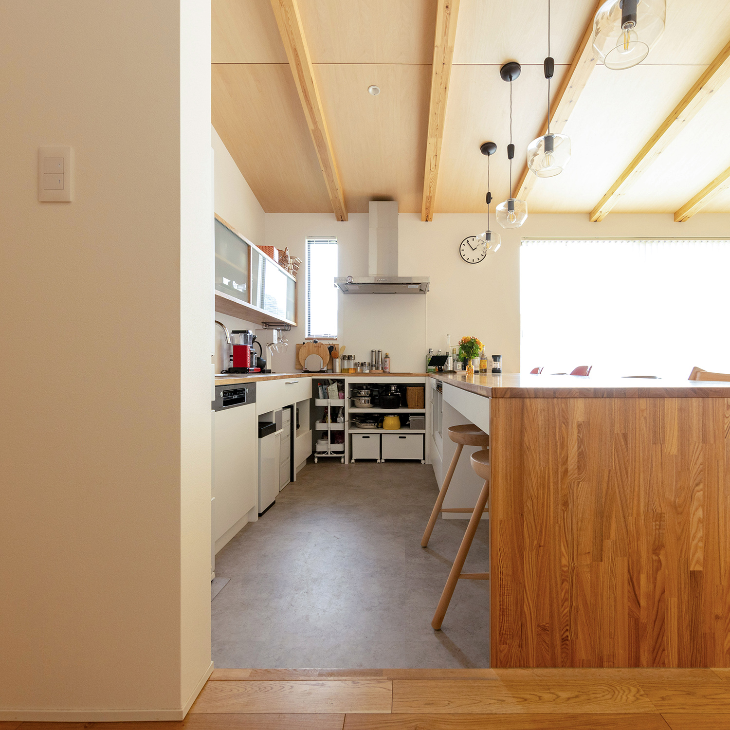 オリジナル造作のコの字型カウンターキッチンを採用することで、ダイニングテーブルを不要にし、広々としたリビングを実現しています。