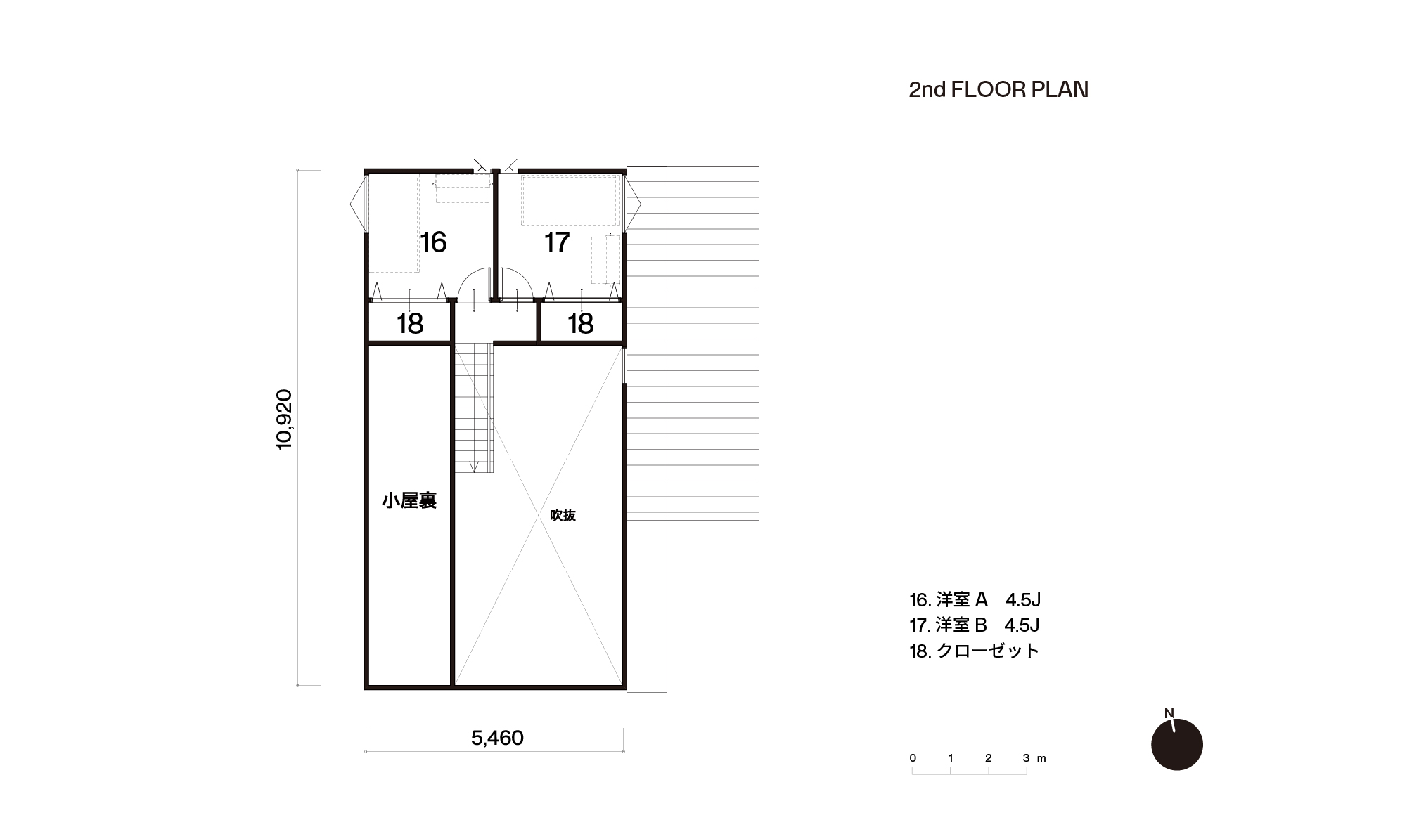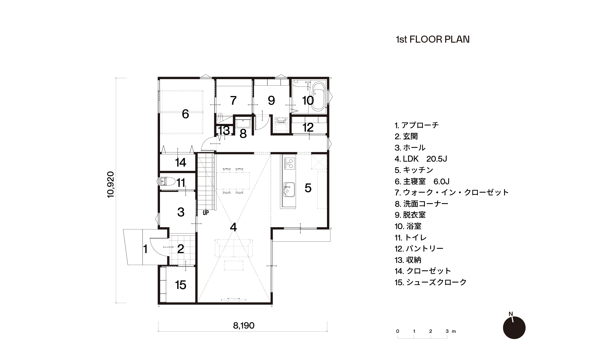 リビング・ダイニングは勾配天井を採用し、開放感に溢れる明るい空間に。勾配天井の一番高い部分には洋室2部屋、1階に寝室を置くことでライフシーンに合わせて平屋のように暮らすことができます。寝室、ウォークインクローゼット、脱衣室、浴室まで、シンプルな動線でつながっており、回遊性も持たせた家事楽々な間取りになっています。