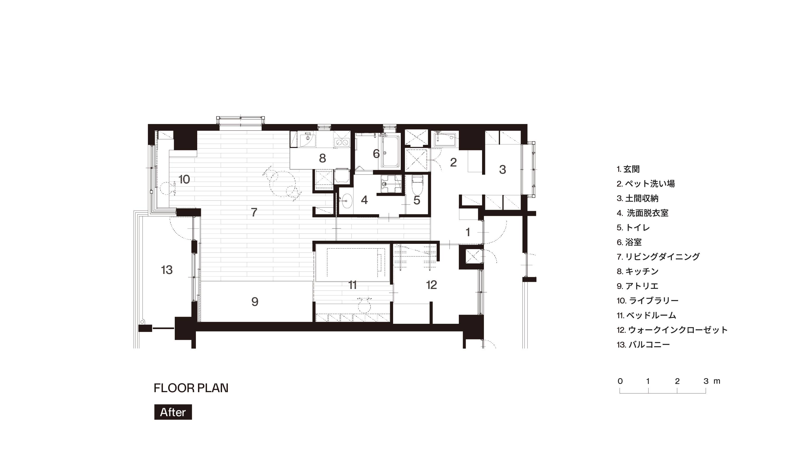 リビングダイニングとアトリエがシームレスに繋がった広い空間、椅子でもソファーでも読書が愉しめるライブラリー、コンパクトなキッチン空間、愛犬用の水廻りスペースなど、そこに住む家族の価値観や優先度に応じたスペースの広さ、設備をゾーニングしました。