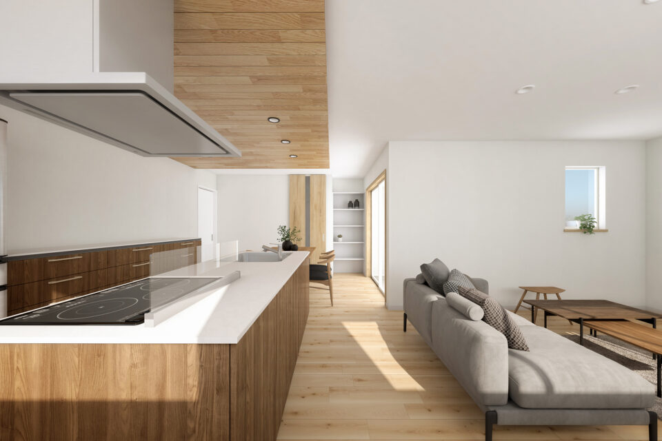 共有空間を中心に各空間を配置した平屋の住まい。LDKはキッチン上部の木材をアクセントに個性を演出しました。コンパクトな3つの洋室は、寝室や書斎、ゲストルームなど目的に合わせた空間活用を可能に。すっきりとした生活動線のシンプルな住まいです。