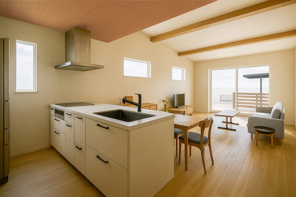 共有空間のリビングは上部を勾配天井とし、開放感ある空間に。隣接する約5畳の洋室は、趣味や作業スペースなど用途に合わせて活躍します。玄関からウォークインクローゼット、水廻り空間の動線は外出や帰宅時もスムーズ。快適と心地よさを叶えた平屋の住まいです。