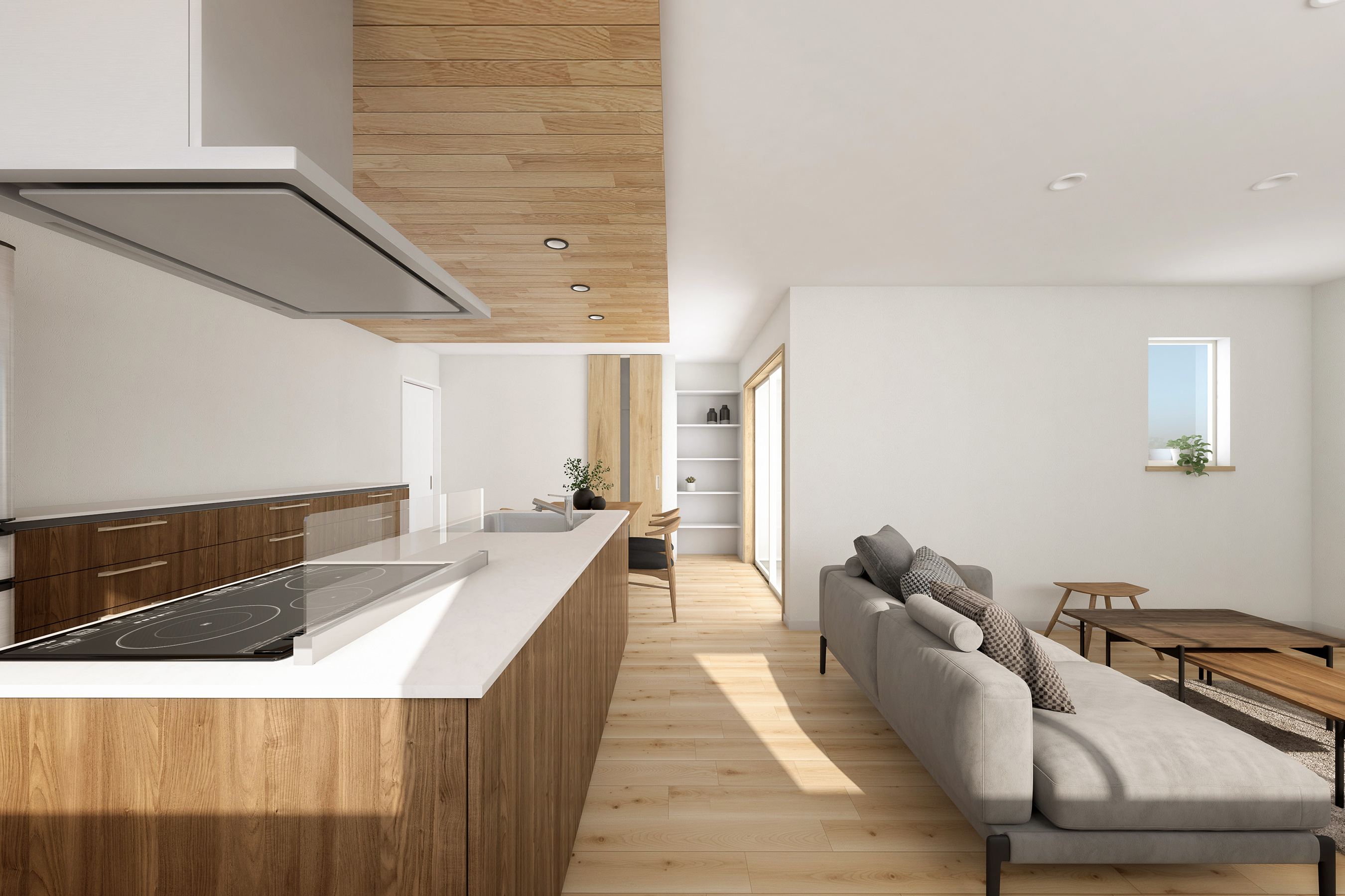 使い勝手のいい家事動線やマグネットボードのあるスタディカウンター、収納力のあるシューズクロークなど、便利さを追求。勾配天井で伸びやかなリビングと空間に奥行きをつくる室内窓により、家族団欒の空間を彩ります。細かな部分にオーナーの知恵の宿ったモデルハウスをぜひご覧ください。